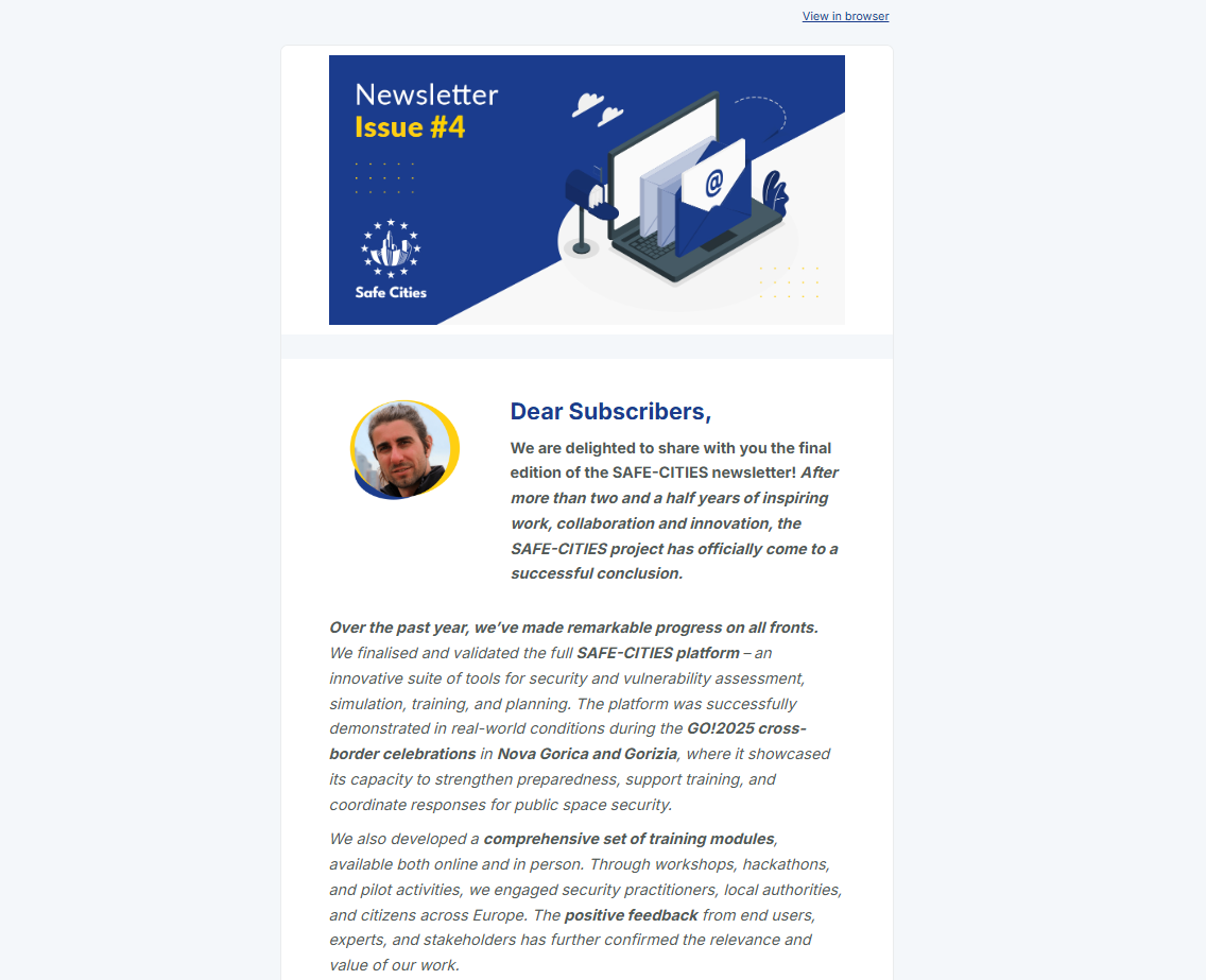 Welcome to the Downloads Page. This is a hub for files related to SAFE-CITIES. Scroll down to find the project reports, newsletters released by us, publications relevant to our project and promotional materials for use.